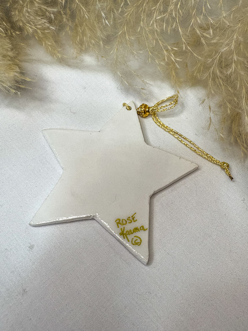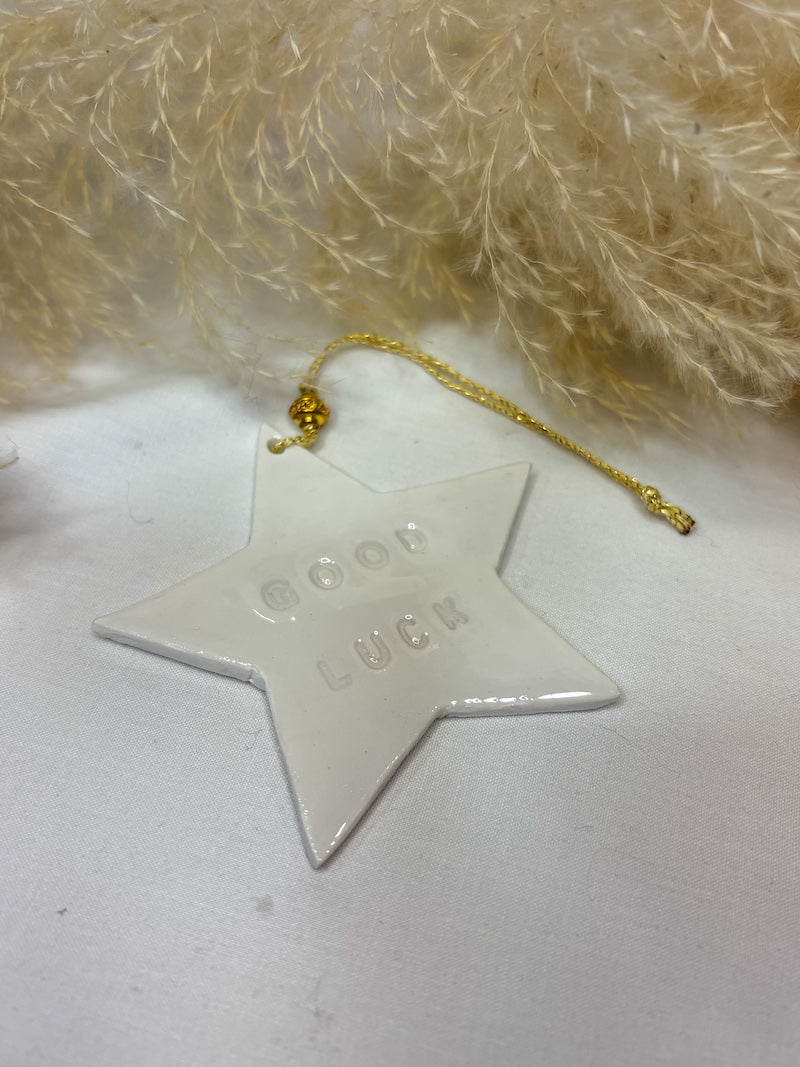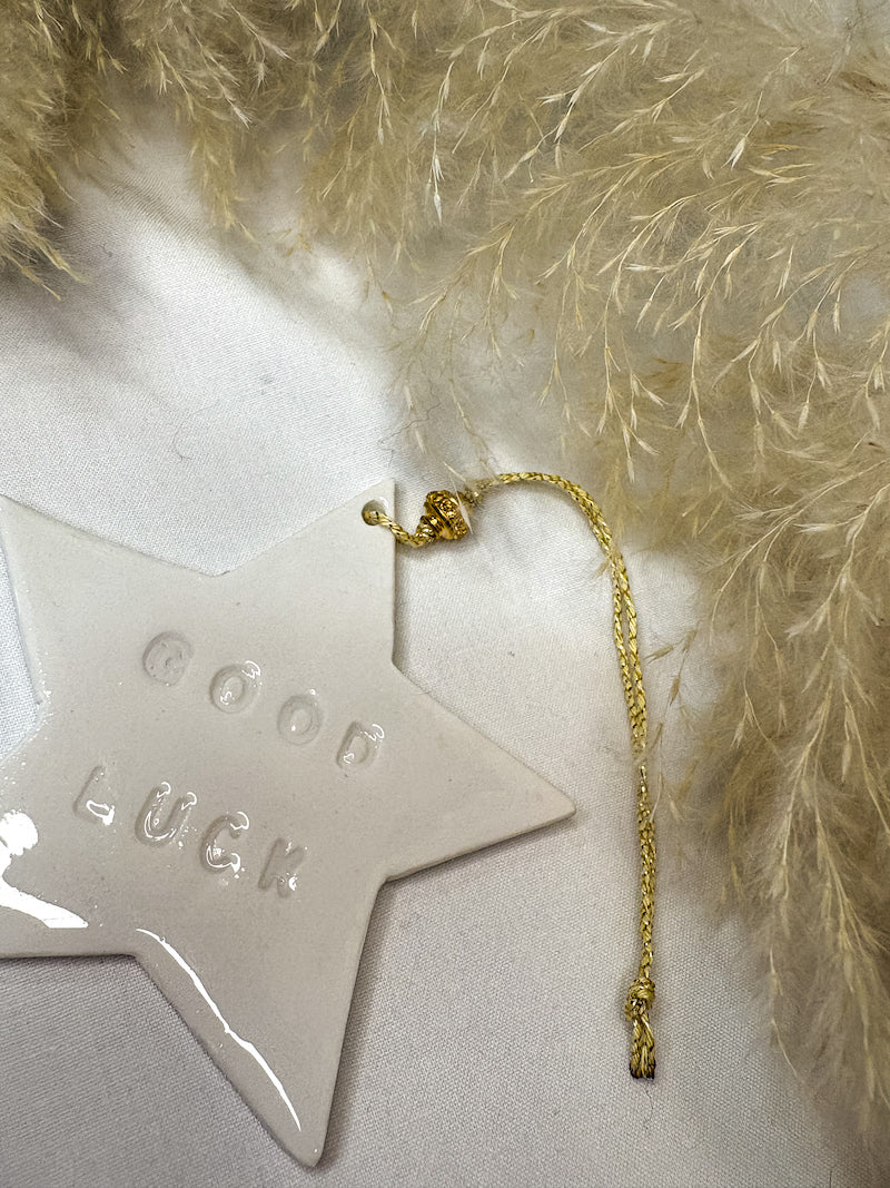 Cette délicate étoile en pâte auto-durcissante émaillée, faite main avec soin, porte l’inscription "Good Luck" et un petit détail étoile dorée en relief. Véritable talisman décoratif, elle invite à la chance, à la lumière et aux ondes positives