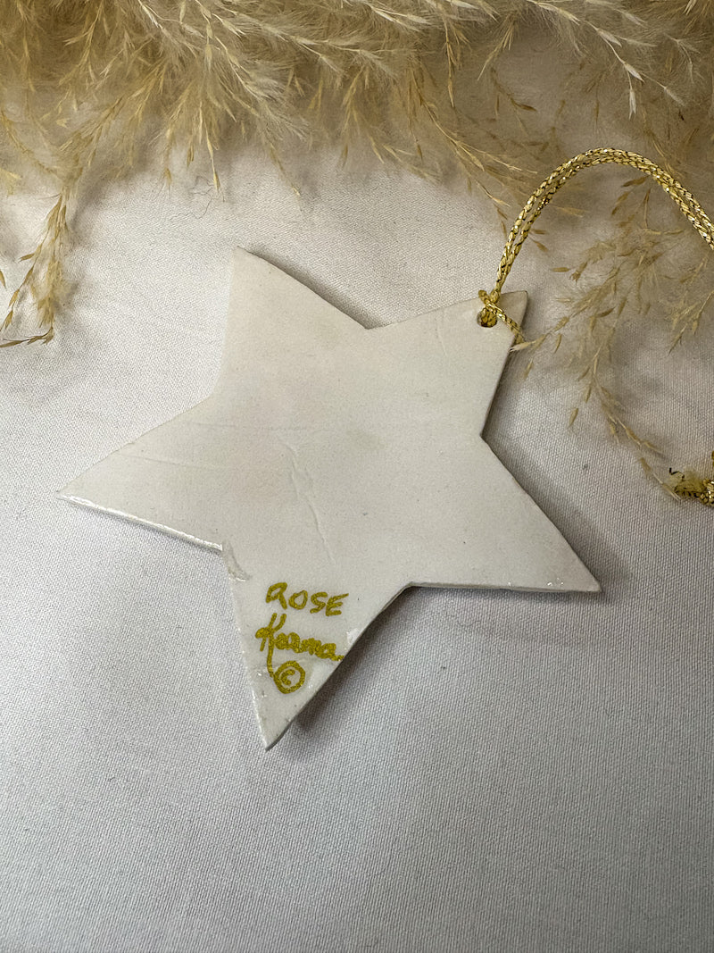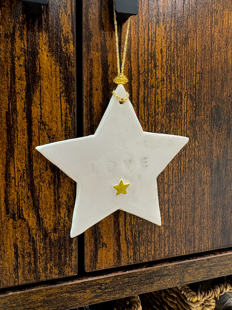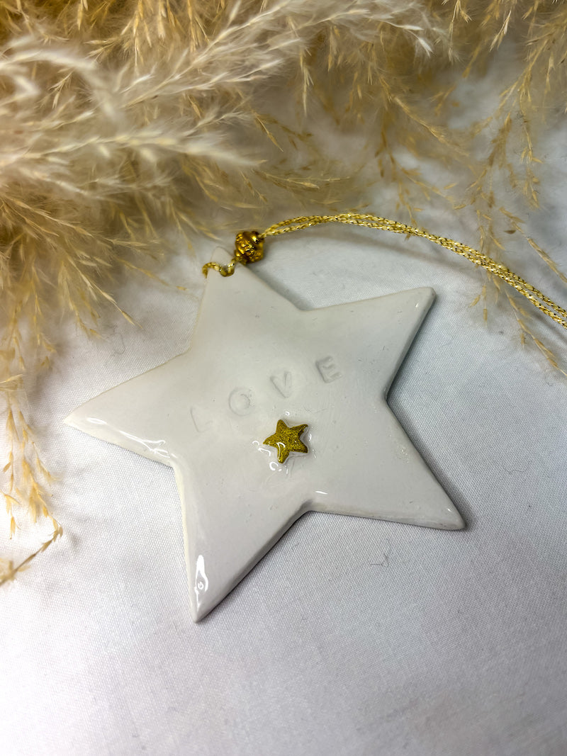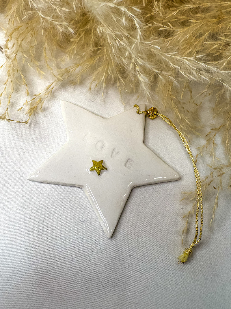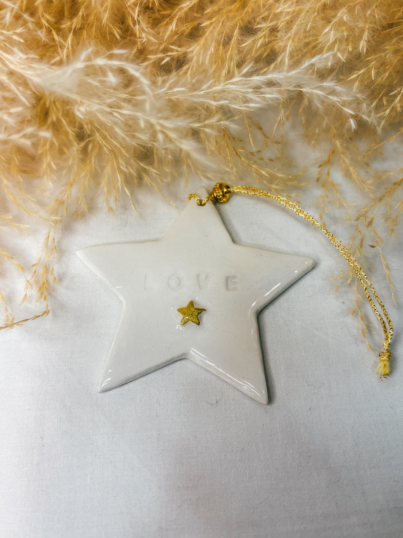 Apportez une touche de douceur et de magie à votre intérieur avec cette délicate étoile en céramique émaillée, façonnée et gravée à la main. Au centre, une petite étoile dorée scintille comme un porte-bonheur, tandis que le mot LOVE y est discrètement inscrit, pour diffuser une belle énergie autour de vous