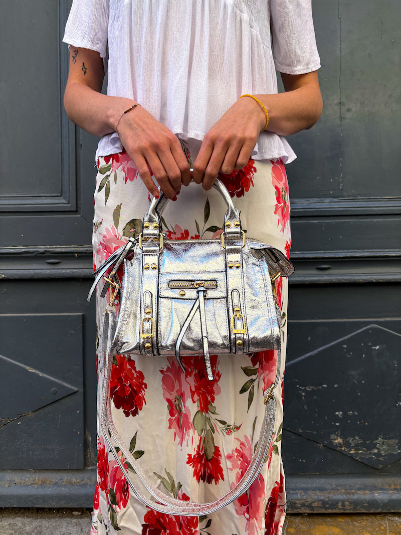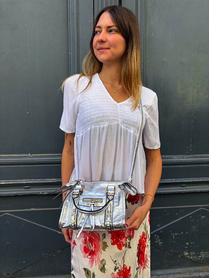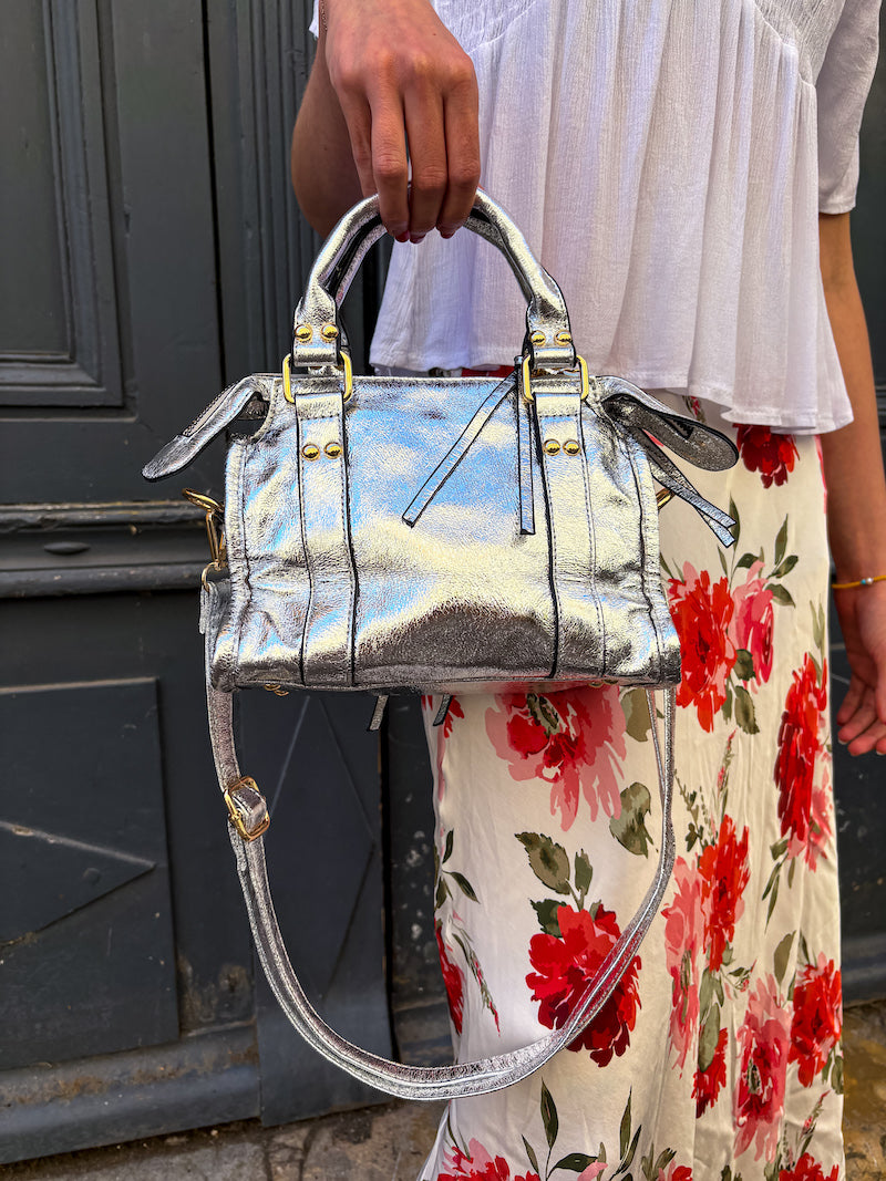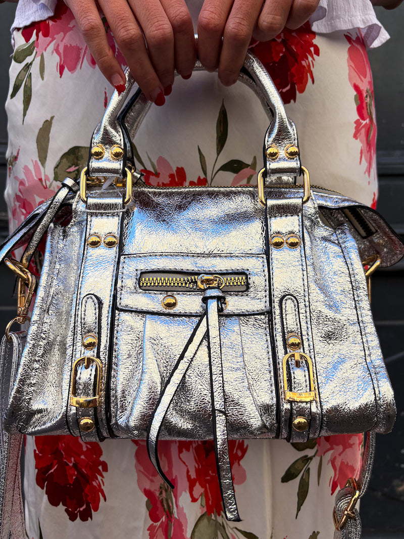 Affichez votre style avec ce sac à main en similicuir argenté brillant, inspiré du célèbre modèle City. Son allure à la fois audacieuse et féminine en fait l'accessoire parfait pour dynamiser toutes vos tenues.