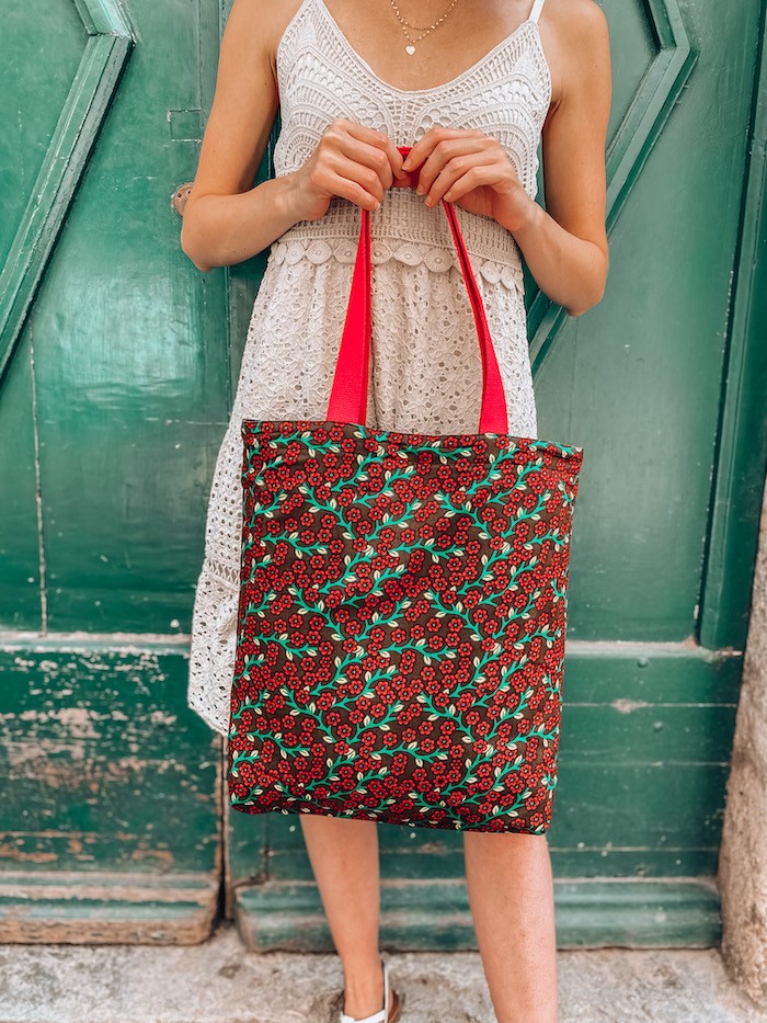 - La face de la Pin Up est en Jacquard, le verso en jean noir et l'intérieur imprimé fleuri