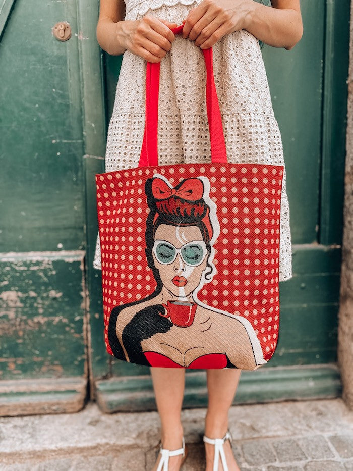 - Ce joli tote bag représente une Pin Up sortie tout droit des années 50, vous adorerez son coté pratique puisqu'il est 3 en 1, il peut se porter coté recto, verso et il est également réversible